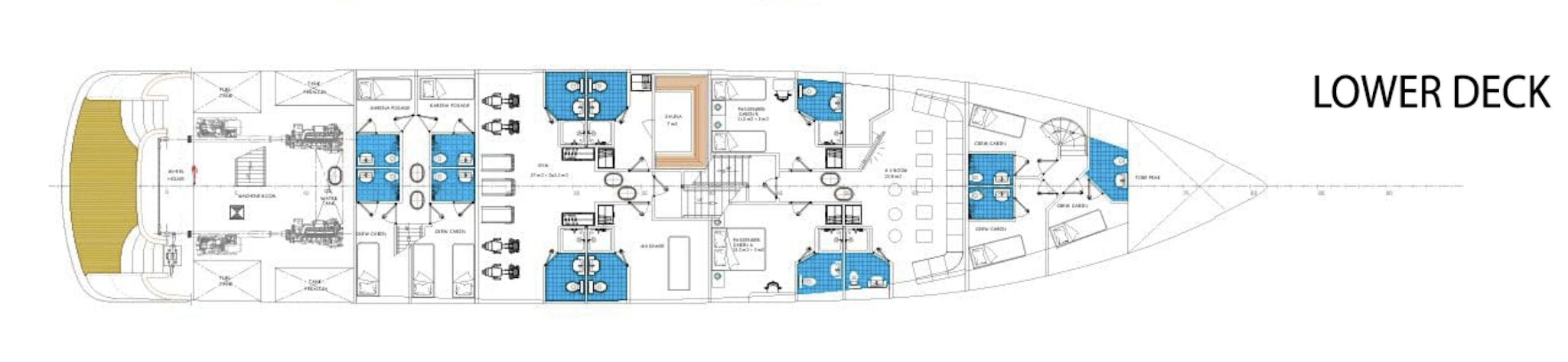 Agape Rose was renewed in 2021 and upgraded with a gym, sauna, massage room, and video room. At a 48.5 m / 160 ft length, she can comfortably accommodate up to 24 guests in 12 ensuite cabins spread over three decks. Cabin options include double, triple, and twin rooms featuring air conditioning, LCD, a safe box, ample storage space, and brand-new ensuite facilities.