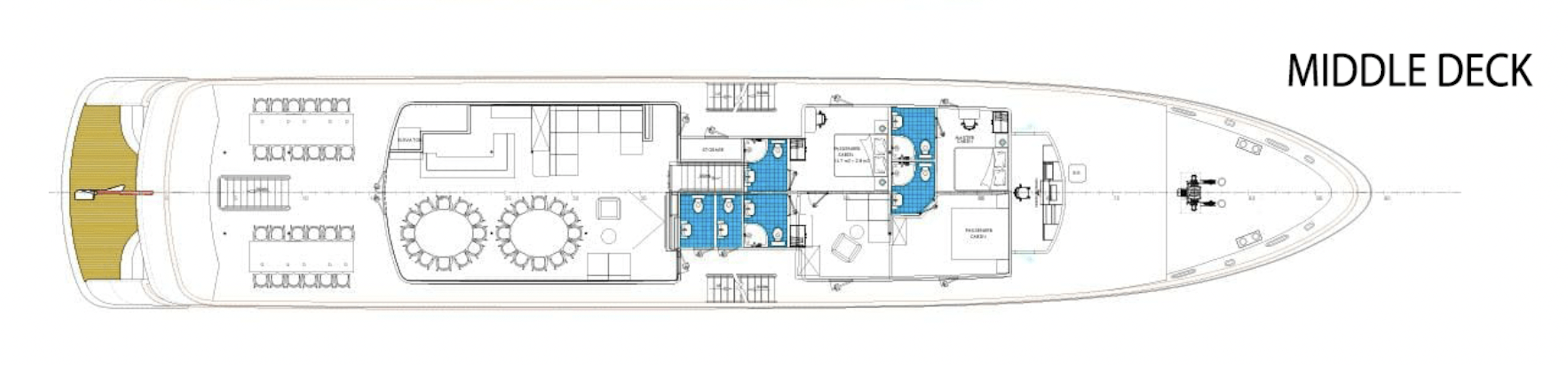 Sun lovers will relax on the sun loungers and have a refreshing bath in the jacuzzi. The upper deck has a fully air-conditioned salon and dining room, large enough to accommodate everyone comfortably. For breakfast every morning, a buffet is served, including tea, coffee, fresh fruit, and followed by afternoon snacks.