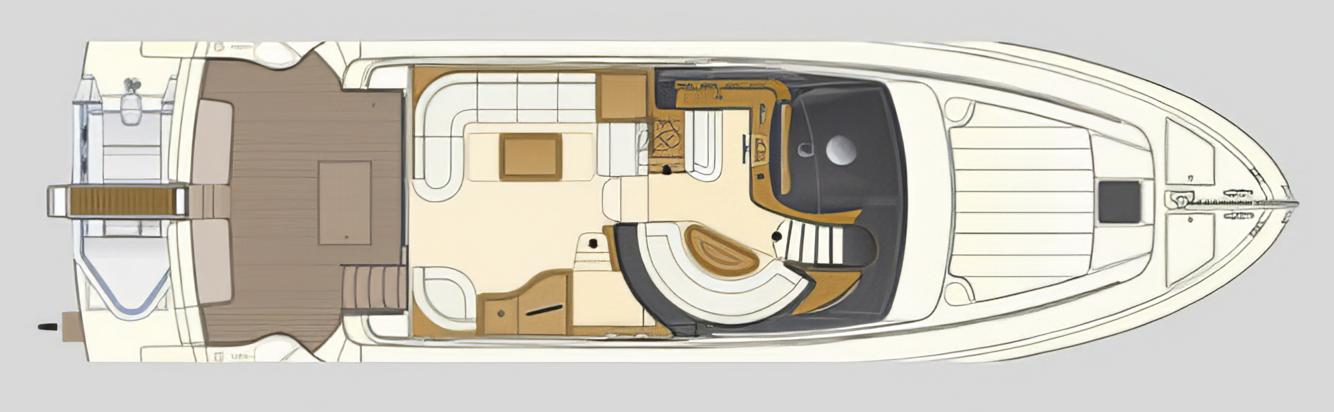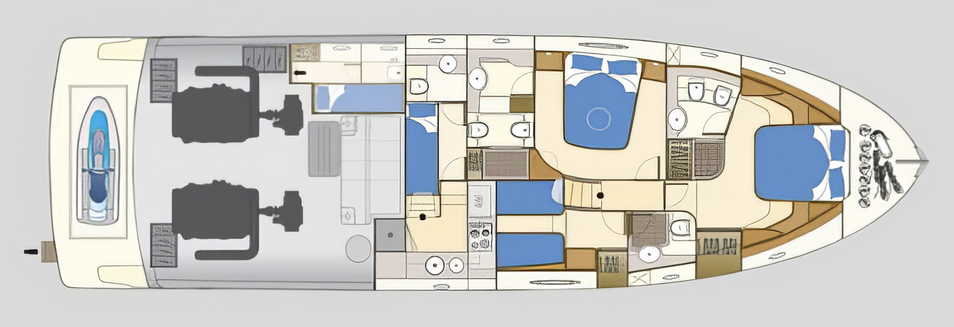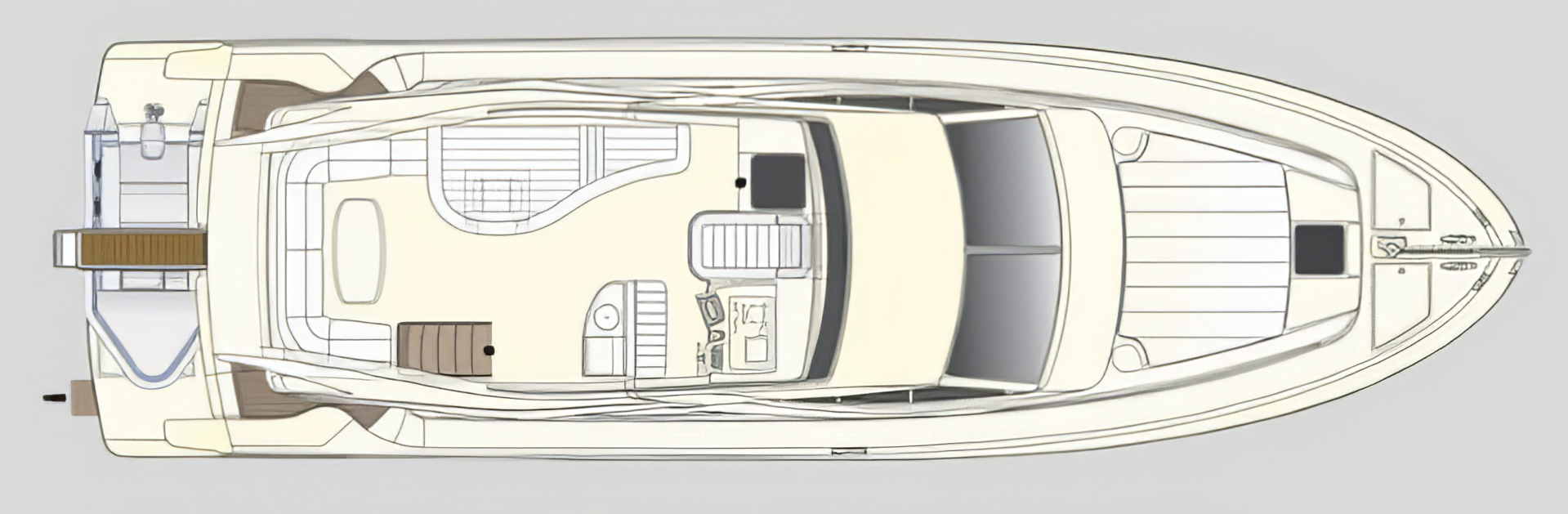 Ferretti 591 offers the perfect balance of size, performance, and comfort. The yacht accommodates six guests in 3 cabins or ten guests for a day cruise. The external layout provides enough space for the whole group to enjoy the sunshine or hide under the shaded area from the swelter.