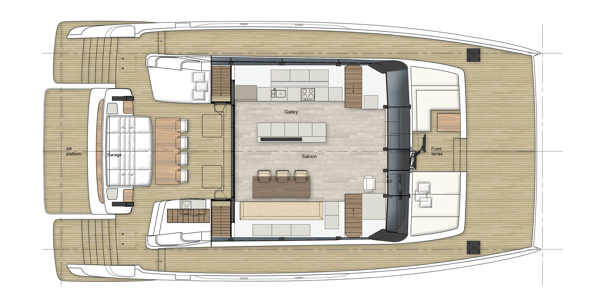 The comfort that this yacht offers is in abundance. The attractive huge main deck with the saloon is seamlessly blended with the cockpit to form a large semi-open dining and sunbathing area. Looking from the inside, skylights, panoramic glass, and wide sliding doors let in lots of sunlight.